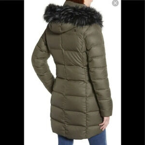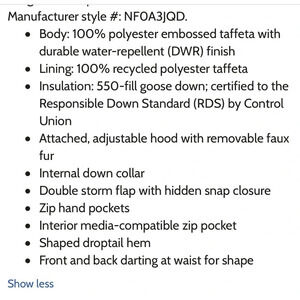 Popular sold-out North Face jacket The North Face® Hey Mama Parkina for women keeps you supremely warm and dry from city street to hiking trail. Features include an attached, adjustable hood trimmed with removable faux fur, an internal down collar, and a double storm flap with a hidden snap closure. Zip hand pockets and an interior zip media-compatible pocket add convenient storage. The North Face Hey Mama parka is finished with embroidered logos at the left chest and back shoulder. Body: 100% polyester embossed taffeta with durable water-repellent (DWR) finish. Lining: 100% recycled polyester taffeta. Insulation: 550-fill goose down; certified to the Responsible Down Standard (RDS) by Control Union. Center Back Length: 36". Imported.
