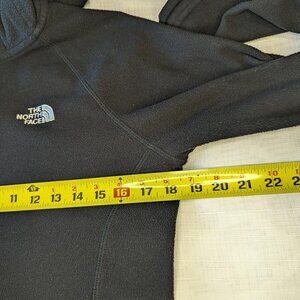 The North Face Hooded Fleece Black Full Zip Jacket in good pre owned condition, there is a mark on the inside of the jacket that is pictured, there also seems to be a missing string for the hood to pull it tighter, size is a women's small, measurements included in the pictures, stored in a clean and professional manner, ships within one to two days. Thank you for shopping Redwood Farmhouse Closet!
