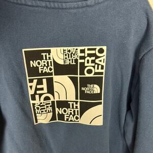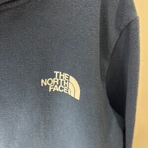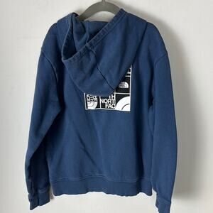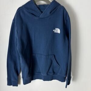 Gently Used The North Face Hoodie Sweatshirt. This is missing its size tag, but my best guess is a boy's small. Check measurements to be sure! Black with a white North Face logo on the front and larger black and white The North Face design on the back. 69% cotton, 31% polyester.