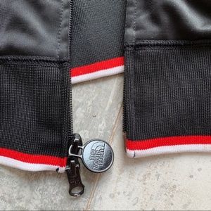 The North Face Jacket type thick Men/Hommes Hoodie Hood Sweatshirt Zip pull Sweater self tie flat laces adjustable hood all the hardware is logo embossed distressed destroyed cuffs full front zip up white red hem elastic sport stripe ribbed trim, not lined, fleece or faux fur imitation, sides extending vapor, zip hidden side slit pockets