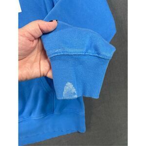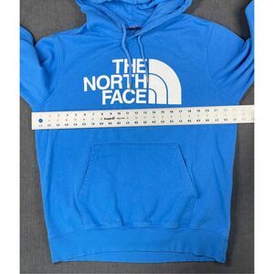 The North Face pullover hoodie in a vibrant blue color with bold white logo graphic. Men’s size large. Features a front kangaroo pocket, ribbed cuffs and hem, and a drawstring hood. Great for casual wear, outdoor layering, or lounging. Soft and cozy fleece interior. Light wear but overall in very good preowned condition. Please see photos for measurements.
