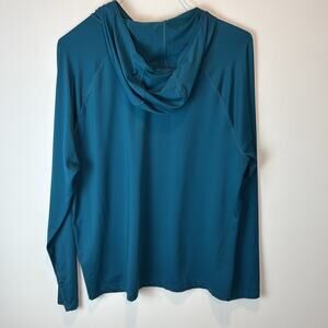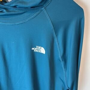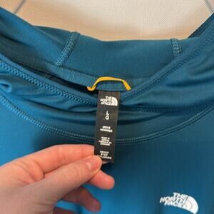 Gently Used The North Face Hoodie Sweatshirt. This is a men's large. Unique shade of green throughout. Bright white The North Face logo on the chest. This is lightweight and stretchy. More athleisure than your normal TNF item. 90% polyester, 10% spandex.