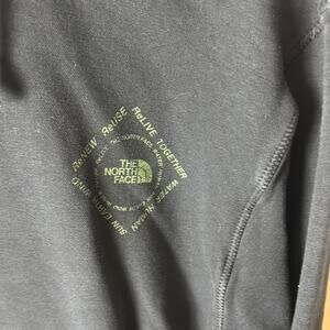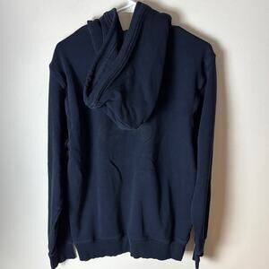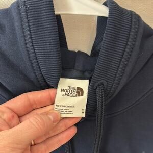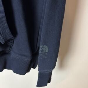 Gently Used The North Face Hoodie Sweatshirt. This is a men's medium. Dark navy blue throughout. Subtle and intentionally faded The North Face with text around it on the chest. Front pocket. Additional logo and design on one sleeve. 60% cotton, 40% polyester.