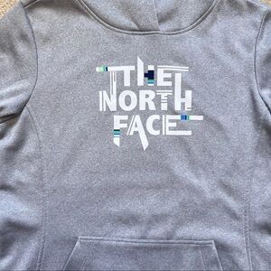 Stylish gray hoodie from The North Face. Features a front pocket and logo design.