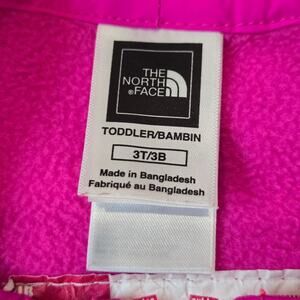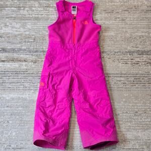 The North Face HyVent snow bibs overalls. Fleece top with adjustable shoulders. Waterproof pants. Pockets. Inner cinch ankles. Perfect for skiing or just playing. High visibility bright pink. Size 3T girls. One small hole in the knee as shown. Original owner, smoke free pet free home.