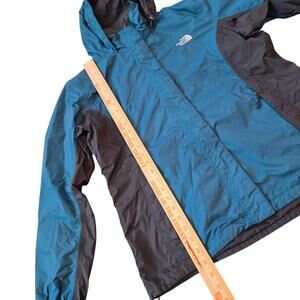 The North Face HyVent jacket, likely a windbreaker or rain jacket in a teal and black color combination. The HyVent technology is a waterproof, breathable polyurethane coating used by The North Face for their outdoor apparel. This type of jacket is designed to block wind and repel water while allowing moisture vapor to escape, keeping the wearer comfortable.