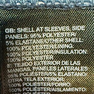 Fabric: Shell 100% polyester; side/sleeve panels 95% polyester/5% elastane; lining & insulation 100% polyester