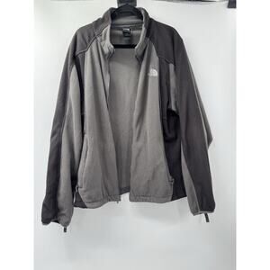 A men's XL The North Face Hyvent jacket in a black and gray multicolor design. This short jacket features a full zip closure, fleece lining, and a stand-up mock neck. It is suitable for travel and casual wear, with a classic and modern theme. The jacket is breathable, easy to care for, and ideal for winter and fall activities such as walking, hiking, and running.