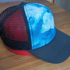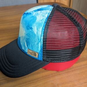 The North Face cap with an ice blue and black design. Features a structured front panel. Good, used condition.