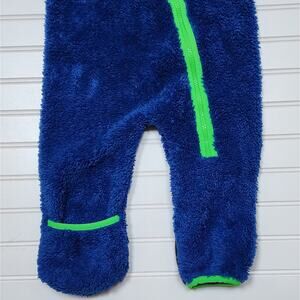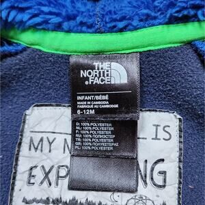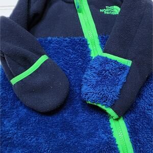 The North Face Infant Chimboraza Fleece One Piece, size 6-12 months, blues and green, zips up front, fold over hands and feet, normal fleece wear, otherwise in good condition.