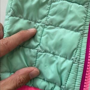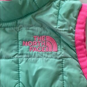 Teal vest with pink accents. Features The North Face logo. Ideal for outdoor adventures.