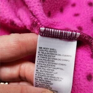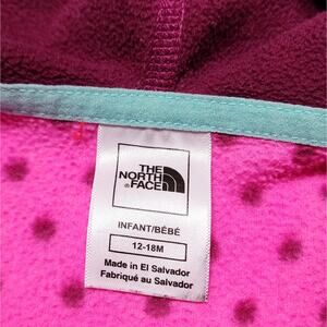 The North Face Infant Glacier Full Zip Polka Dot Fleece Jacket, size 12-18 months, has pockets, has some normal fleece wear otherwise in good condition.