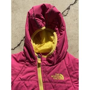 The North Face infant puffer full body bunting for baby. quilted snow suit coat or jacket in pink and yellow with hood and hands and feet protection if desired. Zip front for easy access. Size 6-12 months. Great condition.