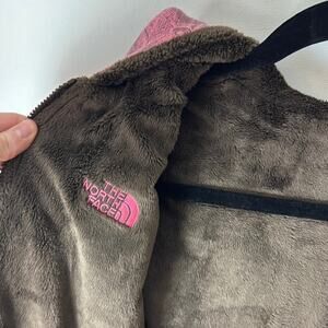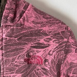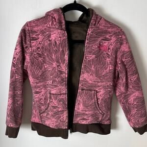 Gently Used The North Face Full Zip Reversible Jacket. This is a girls 14/16. One side is like a sweatshirt material with pink and brown design throughout. Pink The North Face logo on this side. The other side is a silky smooth fleece. Pink North Face logo on this side also. Cute and warm!