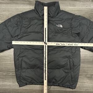 Details: Quilted puffer construction with 550 embroidery on the sleeve indicating 550-fill insulation; embroidered The North Face logo on left chest and back right shoulder; fleece-lined stand collar; full-length front zipper; zip hand pockets; elasticized hem with drawcord for adjustable fit.