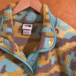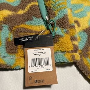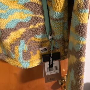 This is new with tags. The color is camo. That primary colors are light blue, brown, and dark yellow. The fabric is 100% polyester. Sherpa fleece. The chest is 42 inches, 21 flat. The length is 25 inches. The sleeves are 21 inches. The shoulder is slightly longer making the sleeves a great fit. The is pullover.