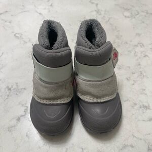 Warm and stylish boots for kids. Gray with pink accents. Perfect for winter fun.
