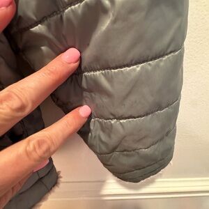 Stylish and warm puffer jacket. Metallic gray exterior with soft pink interior. Perfect for cold weather adventures. Although it is reversible, please see photos. Needs a good wash. It's looks like a sticker of some sort got stuck on it.