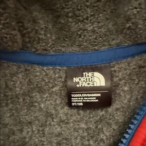 Bold red and gray jacket from The North Face. Includes a cozy hood and durable design. Ideal for outdoor play.