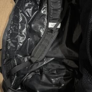 Used The North Face large black duffel bag with adjustable shoulder and carry straps. Durable construction suitable for travel, gym, or outdoor use. Zippers and buckles function properly. Interior is clean with no odors. Shows light wear from normal use—no tears or major damage. Logo intact. Spacious main compartment with side zip pocket.