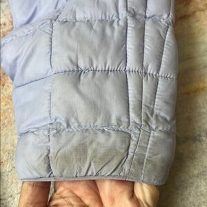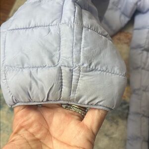 Stylish quilted jacket. Features a cozy hood. Please note wear on sleeve and stain inside zipper (stain is not seen when zipped)