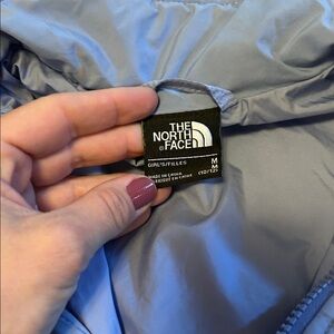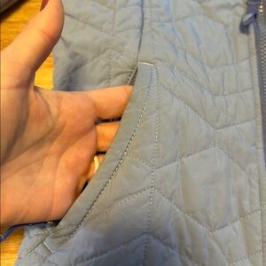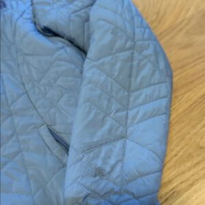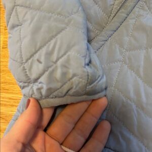 Light blue puffer jacket with quilted design. Features zip closure and side pockets. Ideal for chilly days. Great condition, flaws will come out with a wash. Size medium (10/12).