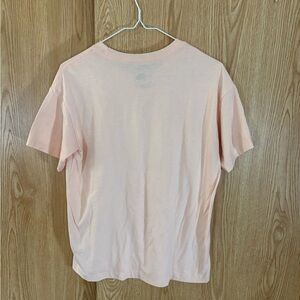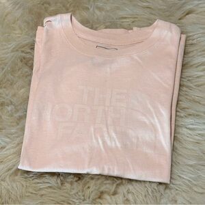 Discover the ultimate in comfort and style with this pink short sleeve tee from The North Face. Made from soft, textured fabric, this classic crew neck design is perfect for layering or wearing solo. A versatile staple, it effortlessly complements any wardrobe. It’s a very light pink with a light white logo on the front. Slightly oversized.