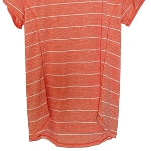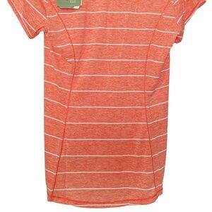 This is made of lightweight, stretchy, and moisture-wicking 100% polyester material. It has a round neck and short casual sleeves.