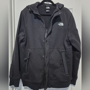 Stay warm and protected in this authentic The North Face men’s jacket. Designed for cold weather with a durable outer shell and cozy fleece lining. Features a full zip closure with snap buttons, adjustable hood, and multiple pockets for storage. Classic embroidered The North Face logo on front and back.