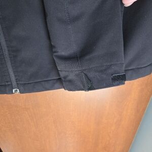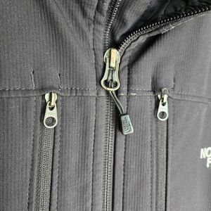 The North Face mens medium jacket. well loved abd showing wear in many pics. tab on the sleeve to tighten at wrist is ripped off and missing. no hood. Durable and sleek design. please see pics for examples of wear.