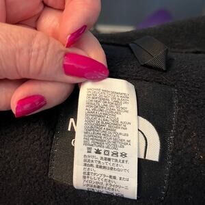 This mens jacket by The North Face has a polyester fleece and nylon shell, with Polartec insulation. Machine wash and tumble dry. This is the Denali Fleece style A193. Bungee cord hem, vertical zip pocket on chest, hip and chest pockets, left arm zip pocket. Embroidered logo front and back.