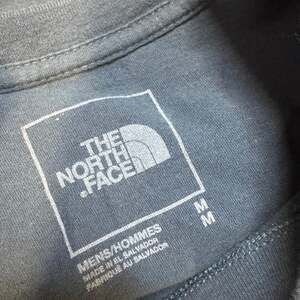 The North Face Men's Box NSE Long Sleeve Tee in Shady Blue, size M. This long-sleeve t-shirt features a distinctive graphic logo on the front with a unique patterned fill, and a small classic logo on the back collar. Made for comfort and casual wear, perfect for layering or as a stand-alone piece. Excellent pre-owned condition with no visible flaws. The material is soft and breathable, great for everyday adventures. Made in El Salvador.