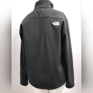 Black softshell jacket by The North Face. Features zippered pockets and logo on chest & back.
