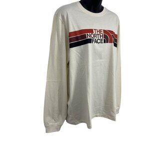 This North Face men's long sleeve T-shirt in cream and red is crafted from a comfortable cotton blend. It showcases the iconic logo across the chest.