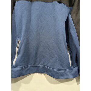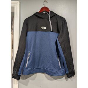 The North Face Men's Mittelegi Hooded 1/4 Zip Sweatshirt Black Blue Colorblock L. Please note attached pictures as the left arm cuff has 3 small holes. They only go through the top fabric layer, not through the entire cuff. There are also two fabric snags on the right arm. Otherwise, the sweatshirt is in great condition. There is no fading. All measurements are approximate.