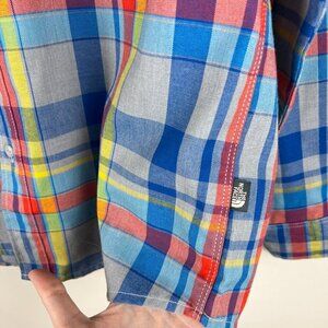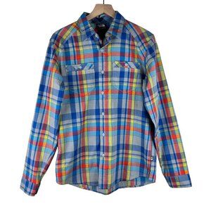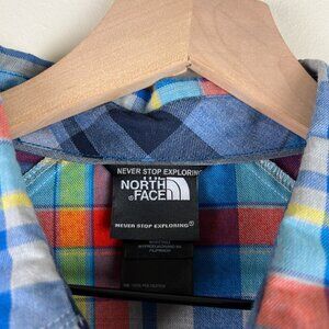 The North Face Mens Multicolor Plaid Tomales Flannel Shirt. Long sleeve. Button down shirt. Built for quick-drying technical performance and featuring hollow core fibers for lightweight warmth. Hiking, camping, outdoors, adventures. 100% polyester. Retail: $70. Size Small. Armpit to armpit: 20". Armpit to end of sleeve: 22.5". Length: 28.5". (735)