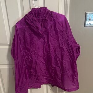 Bold purple utility jacket. Features practical pockets and drawstring hood. Ideal for outdoor adventures.