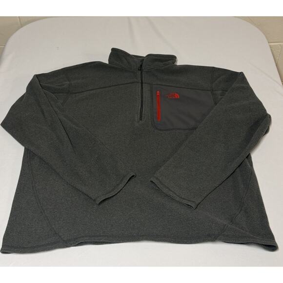 The North Face Men's XL 1/4 Zip Fleece Pullover Jacket in Gray is a versatile and stylish outerwear option for men who enjoy outdoor activities like walking and hiking. Red zipper pocket and logo. No stains or rips.