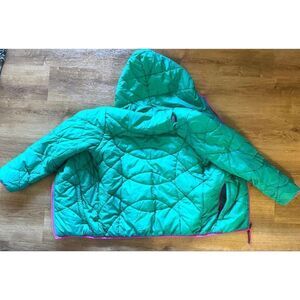 The North Face Moondoggy Green/Pink Trim Reverisble Hooded Girl’s Jacket Size XL. Inside Stripped Slip Pockets both sides. Front Zipper Closure Pull Strip. Size Tag Missing. Excellent Preowned Condition.