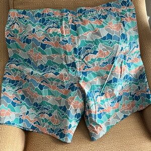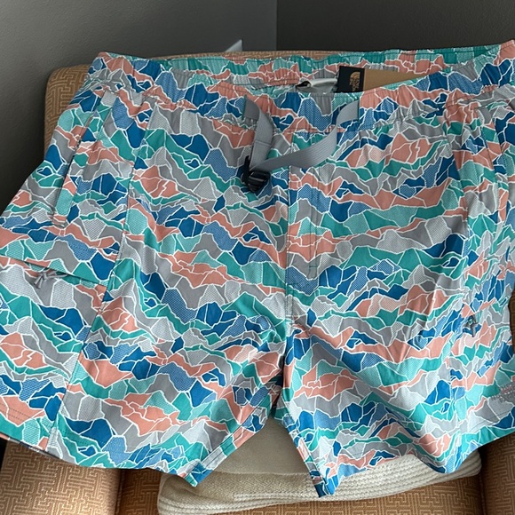 Stylish shorts with abstract design. Features teal, coral, and gray shades. Comfortable and trendy. North Face brand, NWT