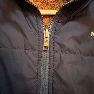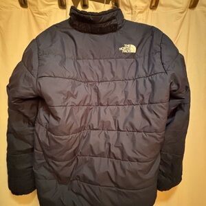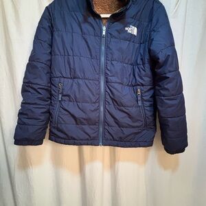 Navy blue Reversible quilted puffer jacket by The North Face. Ideal for chilly days. Worn 2 times unisex in my opinion size medium to small. Non smoking home.