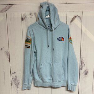 north face patch hoodie, men’s light blue sweatshirt, embroidered novelty patches, fleece pullover hoodie medium, casual travel layer #TheNorthFace #Hoodie #MensMedium #LightBlue #EUC