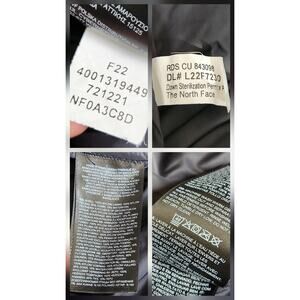 Please look closely at the pictures as they are part of the description . There is no tear , but there is a couple of faint stains as you can see on the close up pix . Some are on the cuffs and by the elbow and one on the chest .