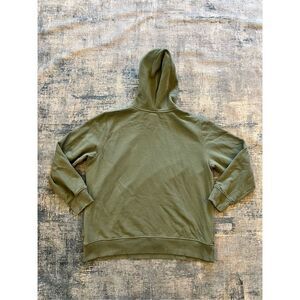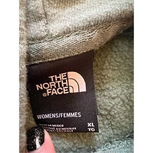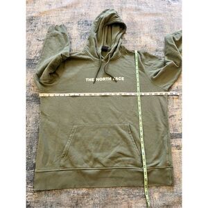 Cozy olive green hoodie. Features front pocket and drawstring hood. The North Face logo on chest.