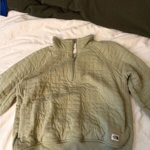 Stylish olive green sweater. Features a half-zip design. Comfortable and warm.