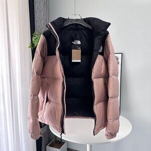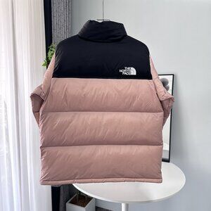 Features a black and pink colorblock design: black on the top and pink on the bottom and sleeves. Stand collar and zipper closure.