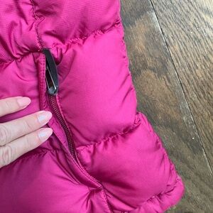 Stay warm and stylish with The North Face Pink Puffer Vest, featuring a vibrant color and a high stand-up collar for added warmth. This sleeveless design is perfect for layering, offering both comfort and insulation with its quilted sections. Ideal for outdoor adventures, this vest combines functionality with a bold fashion statement. can be worn reversible but tags on maroon side