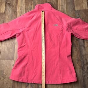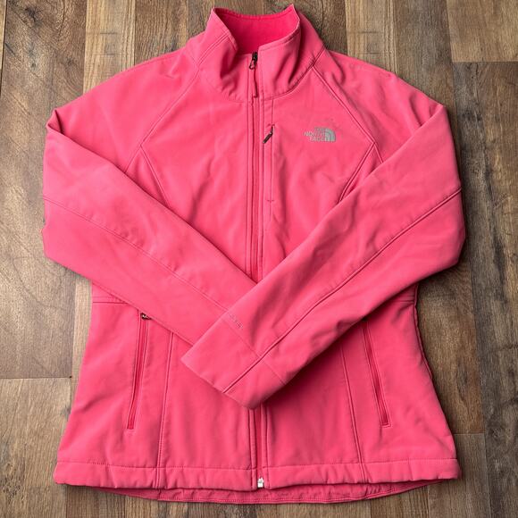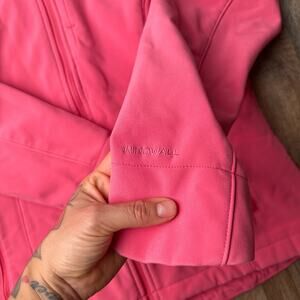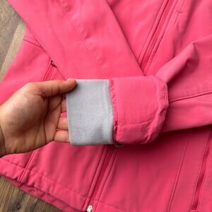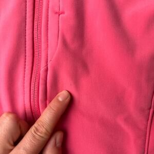 Stylish pink jacket by The North Face. Features a full zip front and side pockets. Perfect for outdoor adventures.
