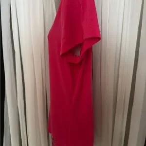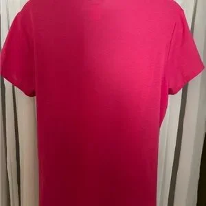 This vibrant pink t-shirt features a stylish v-neck collar and short sleeves, perfect for a relaxed look. The soft lightweight fabric ensures comfort, making it an ideal choice for casual outings. A subtle decorative element adds a touch of charm to this solid-colored tee.