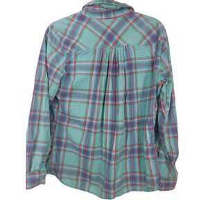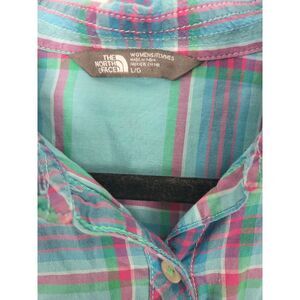 The North Face Plaid Button Front Shirt Large Womens Blue Pink Long Sleeve Roll